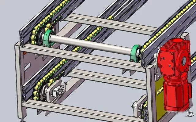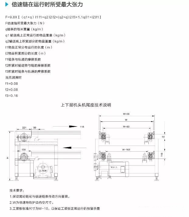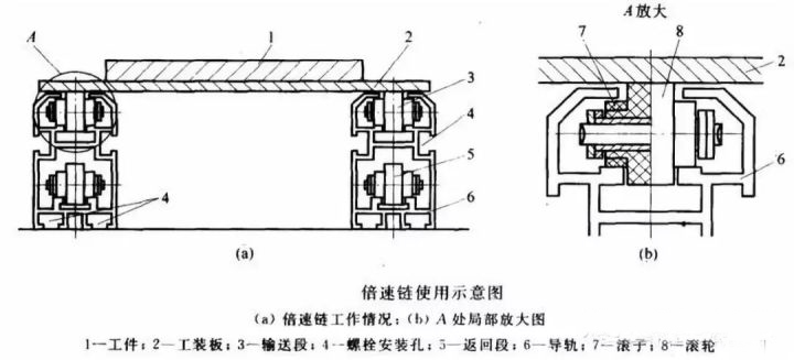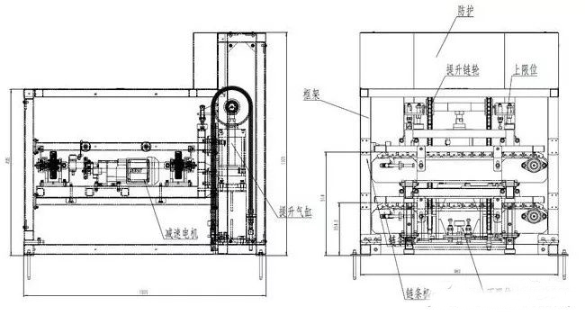 倍速鏈有雙層倍速鏈和單層倍速鏈。單層倍速鏈一般為環形,首尾相連;雙層倍速鏈上層用來生產,下層跑空板,而回板機實現了上下層之間的輪轉。一般回板機由動力部分和頂升部分組成,動力部分有:驅動鏈條或皮帶、電機、機架;頂升部分有:頂升氣缸、直線導軌滑塊、機架、配重(根據負載大小決定)頂升鏈輪、鏈條、護罩等等。